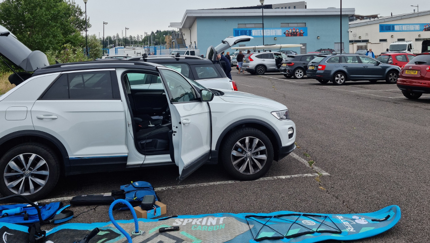 Ar ôl brecwast, aethon ni draw i gofrestru yn DGRhC. Roedd hi’n agos iawn i’n gwesty, 5 munud mewn car. Gwnaethon ni baratoi ein byrddau yn y maes parcio ac yna lawr i’r dŵr â ni. Os ydych chi eisiau padlo ar yr afon mae taliad bach o £5 ac mae angen mewngofnodi yn y dderbynfa, felly dyna wnaethon ni. Ein cynllun oedd mynd i fyny Afon Elái am ryw 2 filltir gan fod y tywydd braidd yn amheus ac roedd gennym gynlluniau prynhawn gyda’n partneriaid. Fe wnaethon ni newid yn y maes parcio, ond mae cyfleusterau newid a thoiledau ar gael yn y ganolfan.