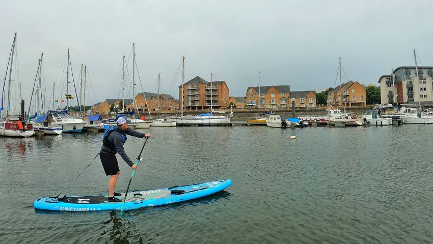 Gwnaethon ni gario ein byrddau drwy’r gatiau ochr ac i lawr ambell ris i’r pontŵn yn hawdd. Roedd yn braf iawn cael lansio yn y marina. Wrth fynd i’r dde, roedd yr afon wedi’i diogelu’n dda rhag gwyntoedd felly roedd yn teimlo fel padliad hawdd. Mae’n ddechrau braf, yn mynd drwy’r cychod yn y marina a’r adeiladau uchel yn gefnlen. Roedd yr Afon yn wag felly roedd yn hawdd iawn i ni. Gwnaethon ni ychydig dros 4 milltir mewn 1awr 20 munud. Ar ôl i ni adael y dŵr, dyma bacio’r offer yn ôl i’r car a gyrru’n ôl i’n gwesty.