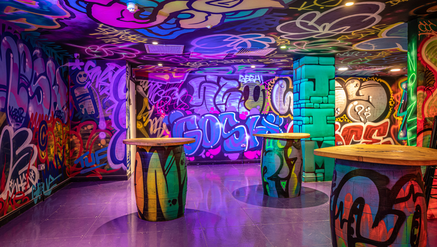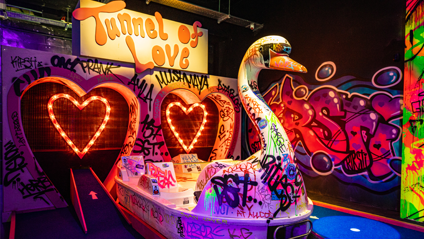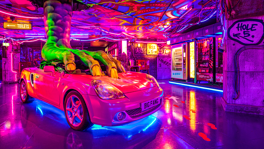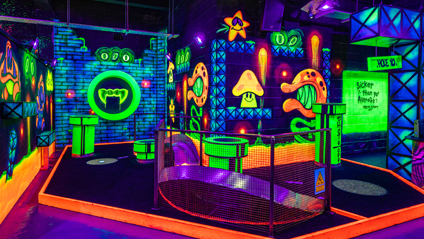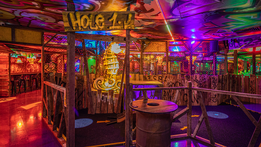 Gyda’n dyluniadau set Instagramadwy unigryw a golff gwallgof, does unman arall yn debyg i ni. Mae Golf Fang yn cynnig y cyfuniad gorau o gwrs golff 18 twll hynod wallgof ynghyd â choctels thema a DJs mewn ardal wedi’i gorchuddio’n llwyr â gwaith celf artistiaid graffiti mewnol a lleol. Rhowch gynnig ar ein sleid gwbl weithredol y gallwch ei defnyddio i gyrraedd y twll nesaf ar y cwrs. Pan fyddwch yn cyrraedd y gwaelod, mae cyfle i fwynhau lluniaeth cyn parhau.