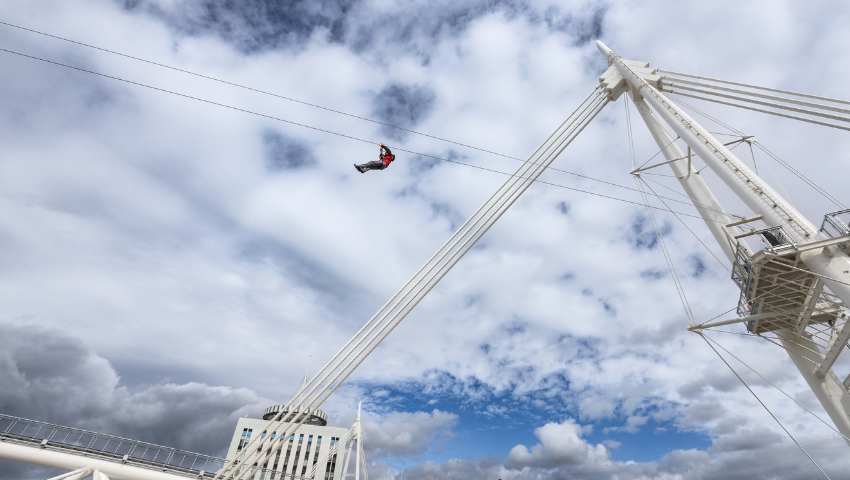 Cymerwch olwg aderyn o’r cae a stadiwm 75,000 sedd islaw cyn dringo mast y Stadiwm a hedfan drwy’r awyr ar Y WEIREN WIB ar draws canopi’r to. Gan gyrraedd yn ôl i’r ddaear trwy’r OLLYNGFA, os ydych chi’n meiddio!